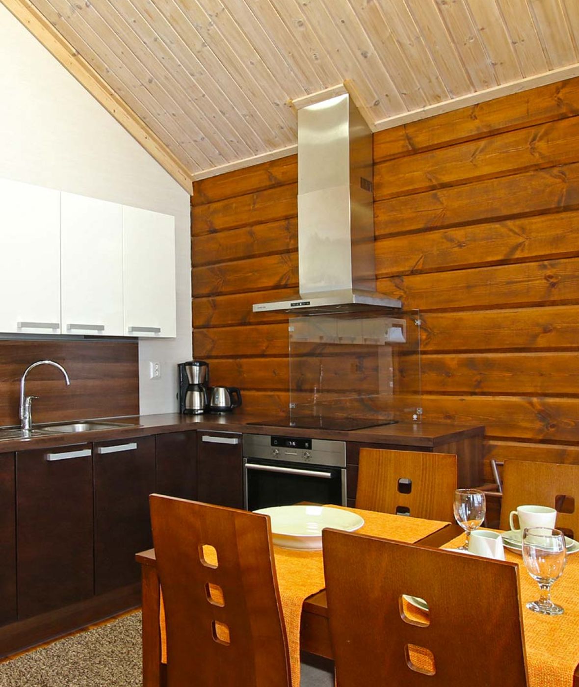 - keittiössä: astiasto, astianpesukone, sähköhella, jääkaappi, kahvinkeitin, vedenkeitin, leivänpaahdin, mikroaaltouuni, syöttötuoli.