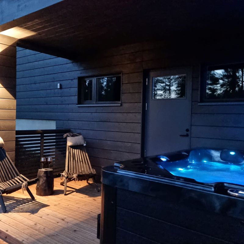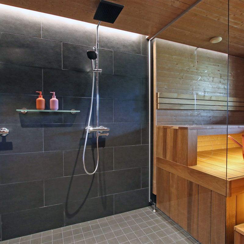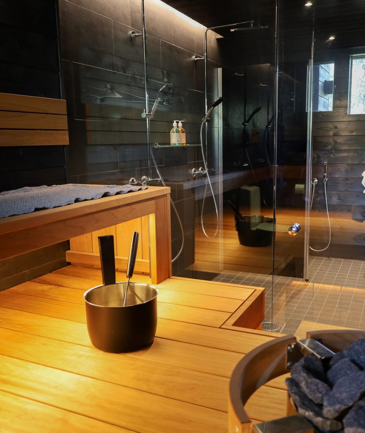 - Saunaosasto kahdella suihkulla, tiloista käynti takaterassille jossa käytössä ulkoporeallas