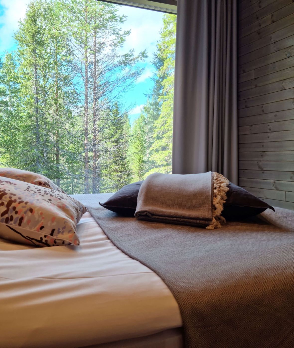 - Makuuhuoneissa koko seinän korkuiset maisemaikkunat